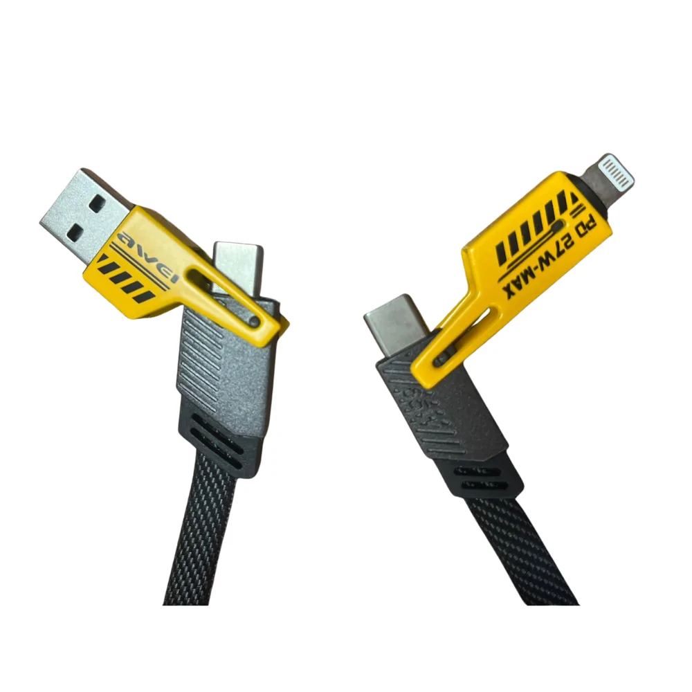 Práctico, versátil y compacto, este cable es la solución ideal para cargar varios dispositivos con un solo accesorio. Cuenta con 4 conectores diferentes (USB, USB-C, Micro USB y Lightning) que permiten alimentar y sincronizar la mayoría de smartphones, tablets, auriculares y otros dispositivos electrónicos.